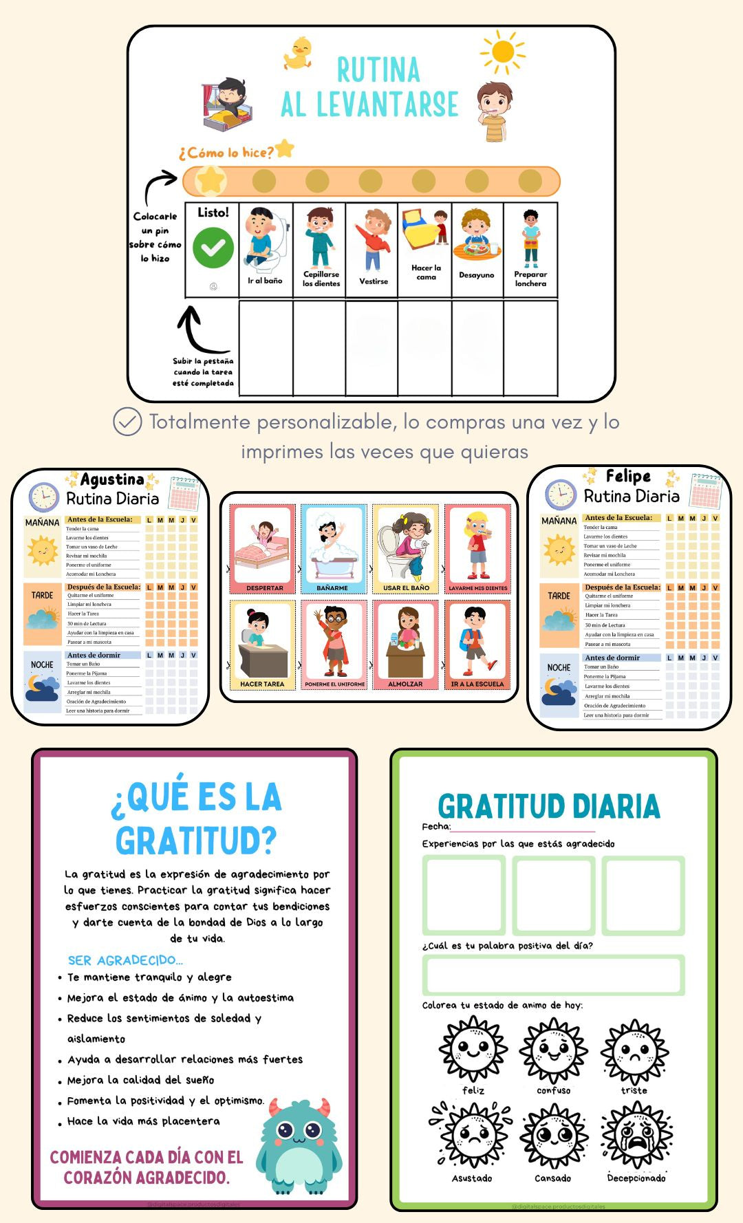 Solo imprimís las rutinas y planificadores, los pegás en un lugar visible (heladera, pieza, escritorio) y listo.